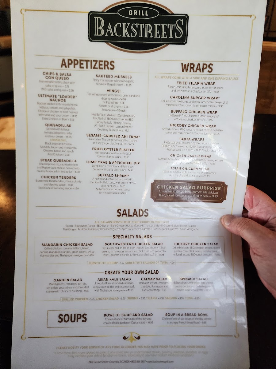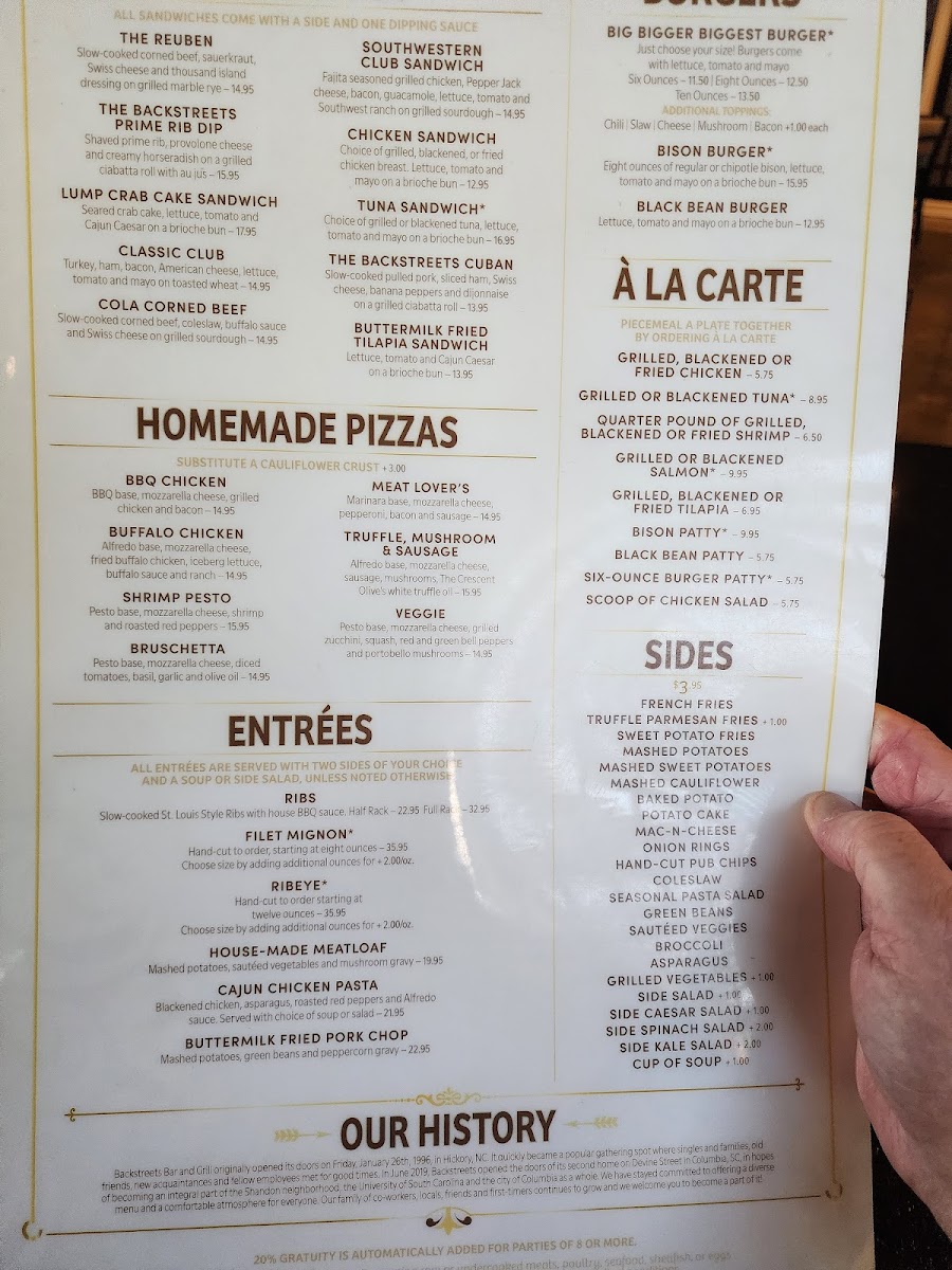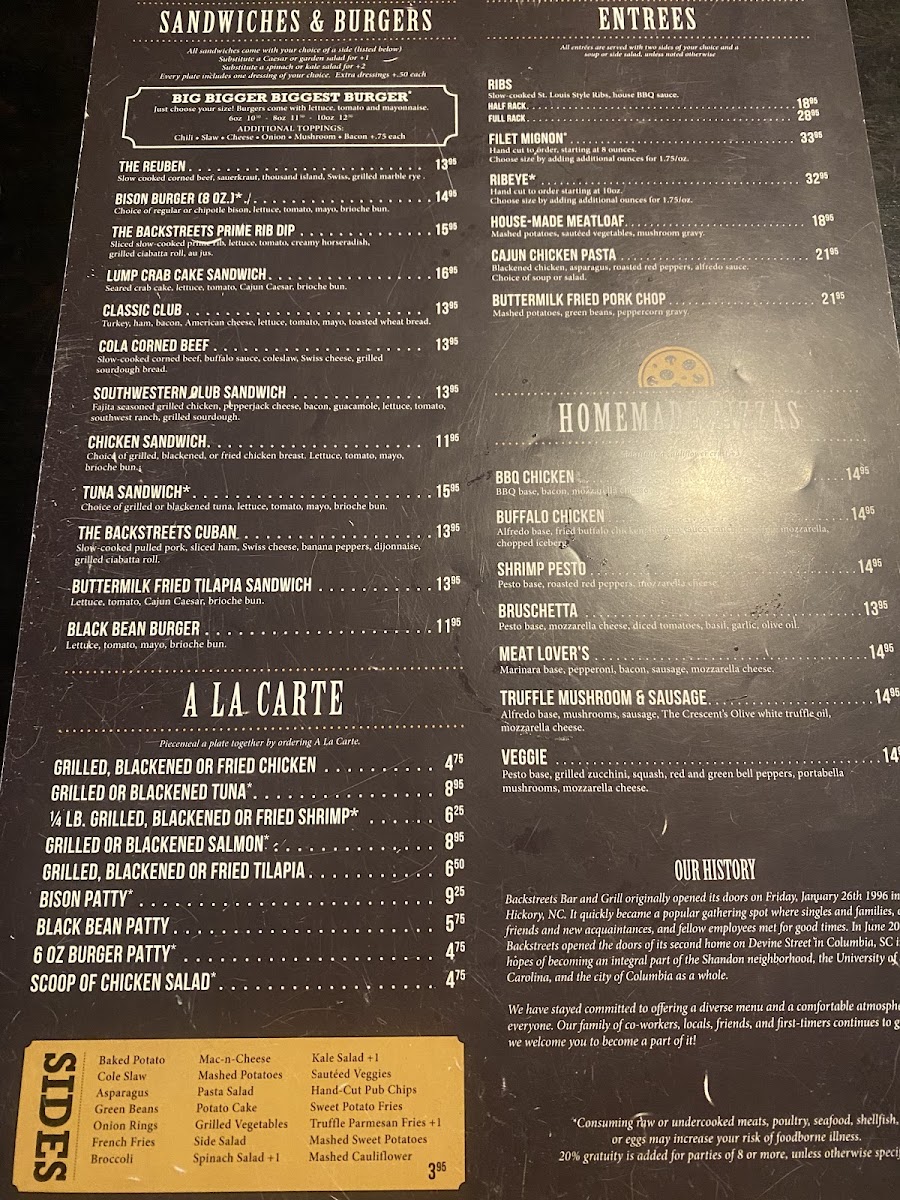 Backstreets Grill, located at 2400 Devine St in Columbia, SC, offers a cozy and casual dining experience that captivates both locals and visitors. Known for its diverse menu, patrons rave about the house-made black bean burger and flavorful barbecue, considered some of the best. The attentive service consistently impresses, with staff members like EJ and Anne Marie going above and beyond to enhance the experience. Meals such as the Cajun Chicken Pasta and cauliflower pizza leave diners craving more, highlighting generous portions and carefully crafted flavors. Overall, Backstreets Grill stands out as a must-visit destination for satisfying meals and warm hospitality.